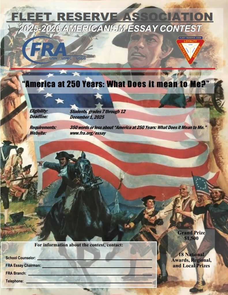 Americanism Essay Contest For Grades 7–12 FRA sponsors an annual essay contest to promote the spirit of Americanism and patriotism among our country’s youth. FRA’s Americanism Essay Contest is open to all students, grades 7 through 12, including those who are home schooled. Students are invited to submit a 350-word essay through an FRA member or local FRA branch before the December 1st deadline. Local winners are forwarded for competition at the regional level and regional winners compete for national prizes. The grand national winner receives $1,500. Other winners receive $1,000 for first place, $750 for second place, and $500 for third place. Each national winner will receive an attractive plaque citing his/her achievement, and every entrant judged at the national level receives a certificate of recognition. Prizes may be awarded to students winning at local and regional levels of competition.